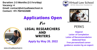 Virtual Law School is looking forward to hire some Legal Researchers and Writers (online mode) for a paid project based on Intellectual Property Rights. Duration of the Project: 2-3 months Vacancy: 4 Stipend: Yes, (will be paid once the project ends) Eligibility Criteria Candidates pursuing pre-final and final year of UG/PG in Law, having IPR […]