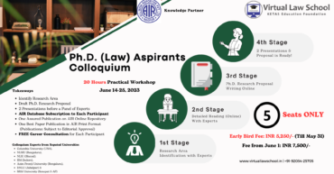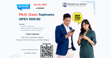 Ph.D. (Law) Aspirants’ Open House by Virtual Law School | May 21, 2023 Time: 11:00 AM An Interactive Forum for Aspiring Ph.D. Scholars to Address Challenges and Seek Solutions About Virtual Law School (VLS) Virtual Law School (VLS) is a leading online platform dedicated to providing high-quality legal education and professional development opportunities. Founded during […]