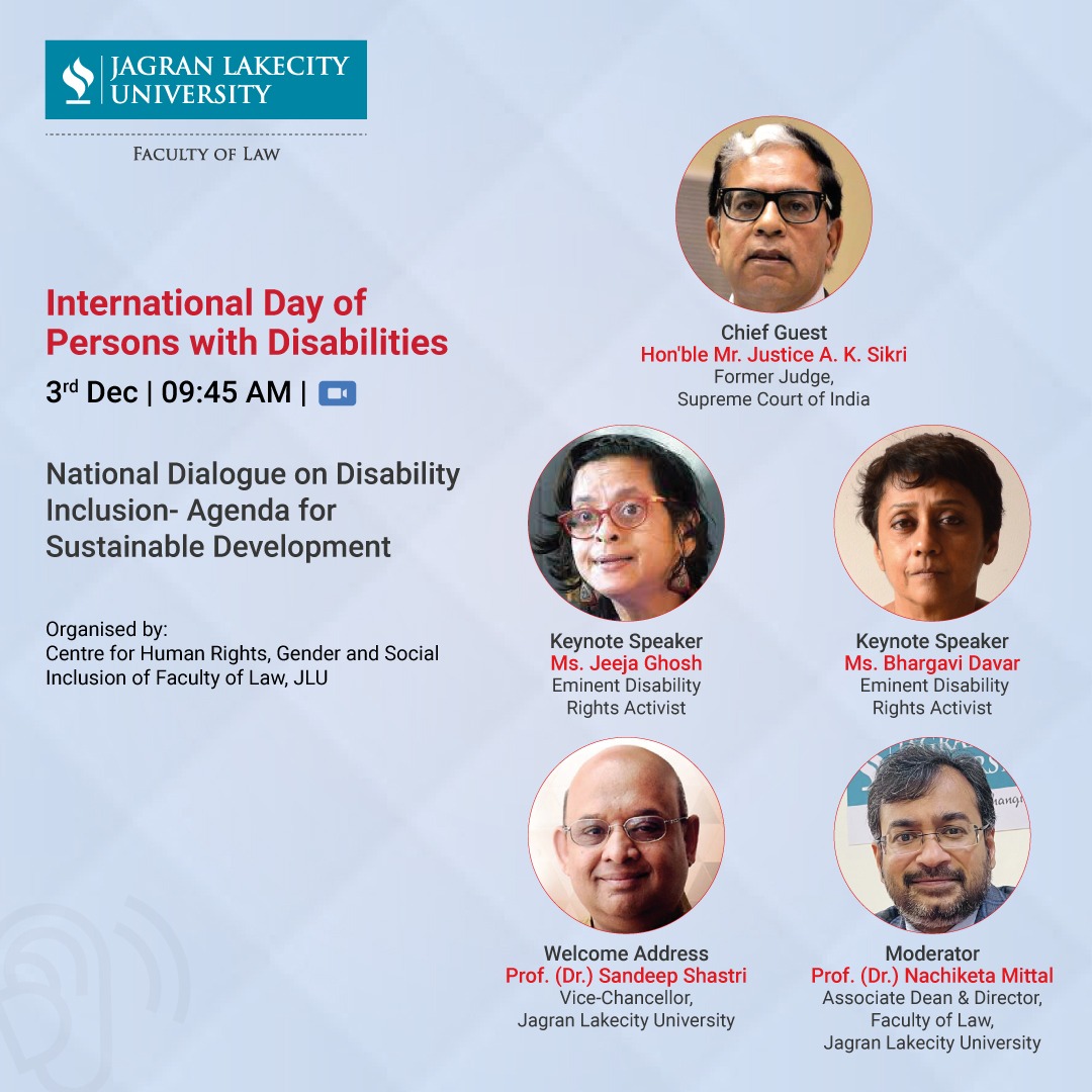 The Centre for Human Rights, Gender and Social Inclusion of the Faculty of Law, Jagran Lakecity University (JLU), Bhopal welcome all stakeholders to join National Dialogue on Disability Inclusion- Agenda for Sustainable Development on December 3, 2021 from 09:45 AM- 10:45 AM.
